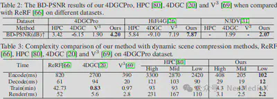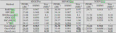 作者在 N3DV、HiFi4G 和自建 4DGCPro 数据集 上进行了全面实验,对比了 ReRF、HPC、3DGStream、4DGC、HiCoM、V3 等方法。